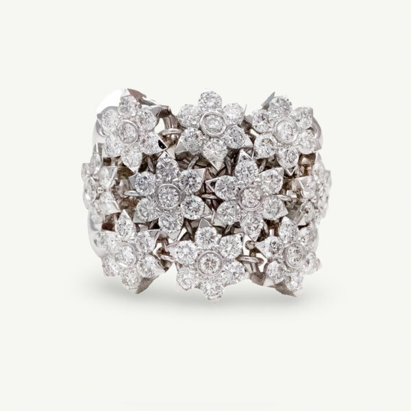 A wide band ring crafted in 18K white gold and composed of multiple diamond-set floral motifs. Each flower is individually mounted and connected in a floral mesh structure, giving the ring a satisfying and playful character. Cut-out heart details along the sides add charm, while its bold form ensures a striking presence on the hand.