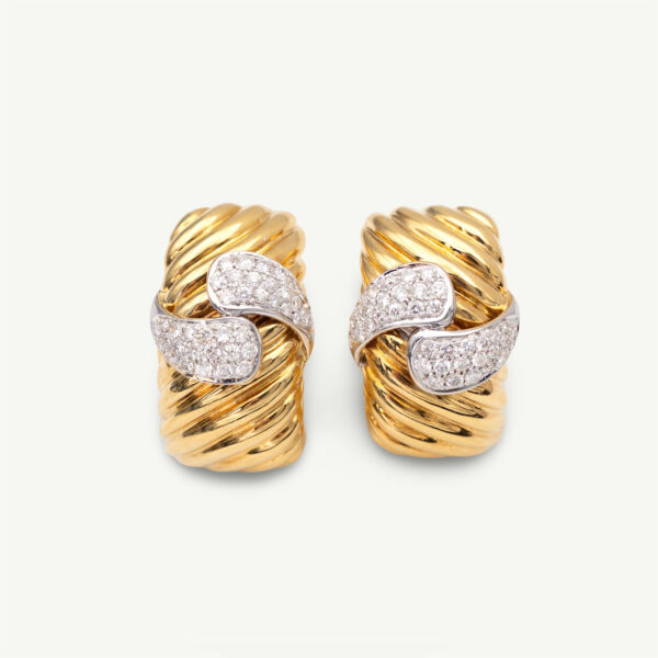Wide ribbed yellow gold earrings, each centred on an interlocking white gold teardrop motif set with diamonds. The diagonal grooves and contrasting metals give the pair a bold, sculptural presence.